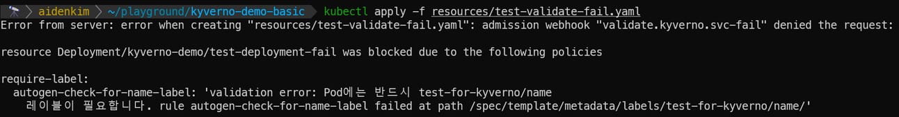As you can see, the resource deployment was blocked. It also displays the informational message we specified in the message field of our validate rule! This shows that Kyverno's validate rule informs the user about policy violations before resource creation and guides them to comply with the policy.